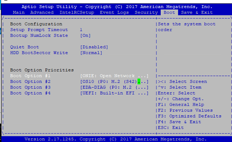 5. Use the → key to move to the right and select the Boot option; then use the ↓ key to move down and select Boot option #1 (in this case the first option is ONIE: Open Networking, and OS10 is the second option).  then press enter