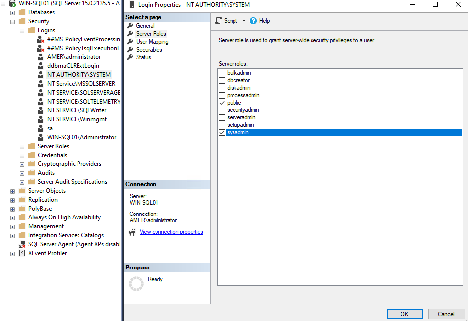 6. Na caixa Server roles, ative a função sysadmin clicando na marca de seleção ao lado dela.