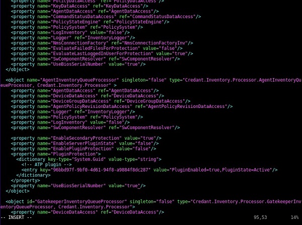 <property name="UseBiosSerialNumber" value="false"/> - 按 I 进入 INSERT 模式(这在 VI 文本编辑器窗口的左下角注明)。