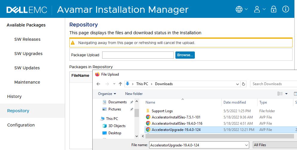 Login with a root credential and navigate to the Repository to upload the upgrade package.