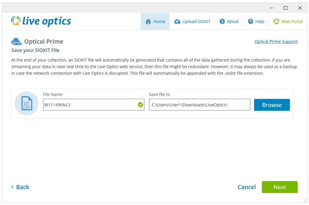 - Telkens wanneer een verzameling wordt uitgevoerd, wordt een versleuteld SIOKIT-bestand gemaakt dat wordt gebruikt als back-up in het geval van een probleem met de netwerkverbinding tussen de Live Optics-collector en de Live Optics-webservice. De upgrade moet handmatig worden geüpload naar de Live Optics-webportal om de resultaten van uw scan te kunnen bekijken. U kunt de bestandsnaam op dit scherm desgewenst wijzigen en vervolgens op Volgende klikken om door te gaan.
