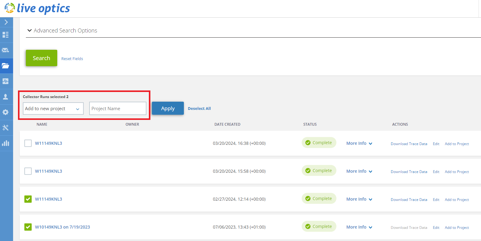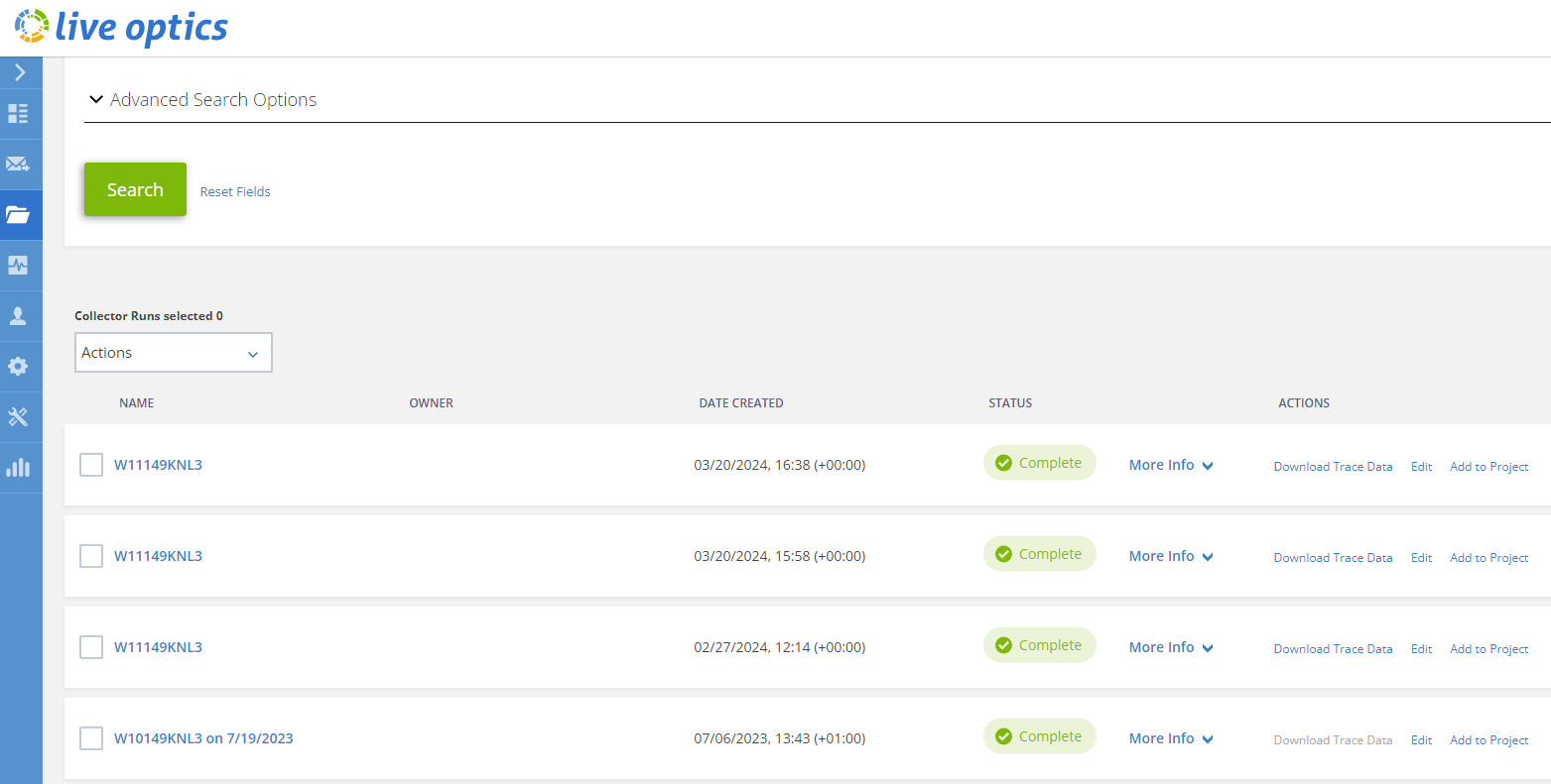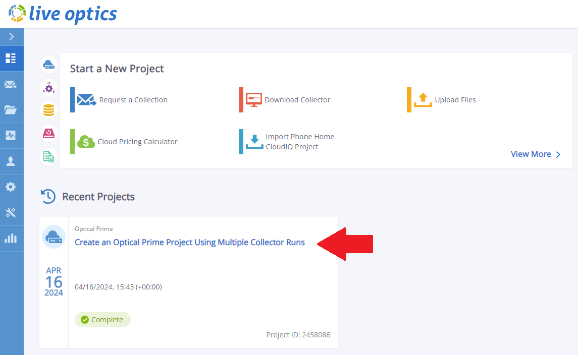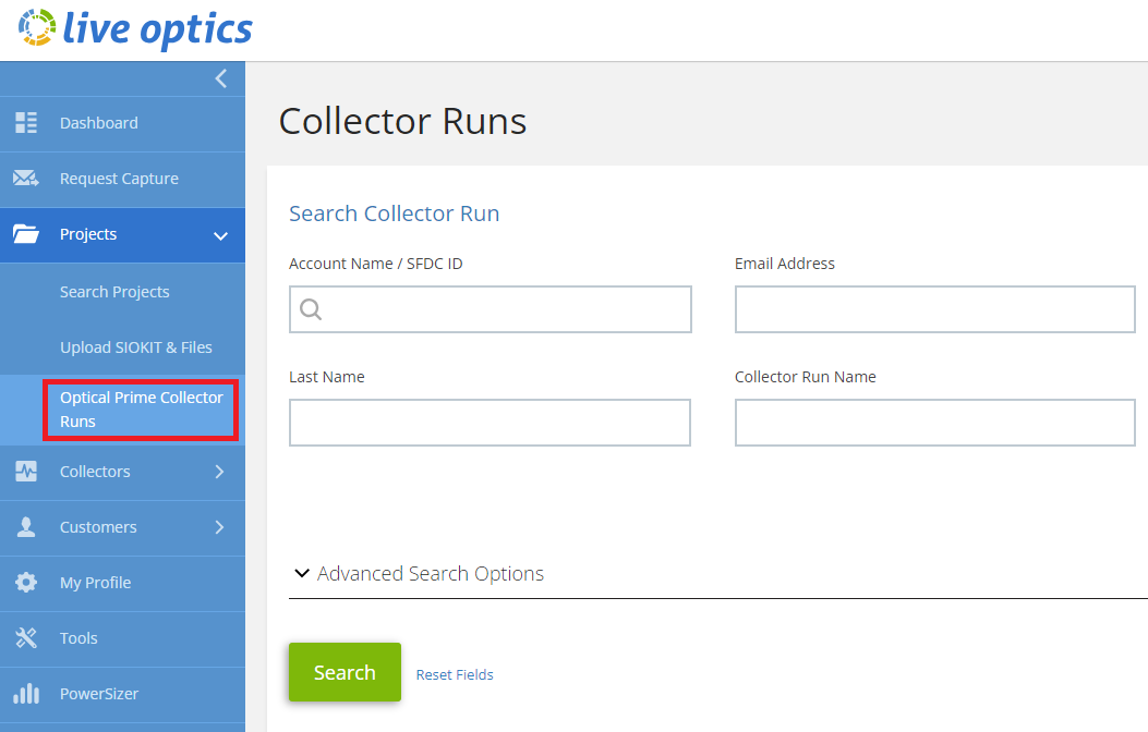 - Log into the Live Optics web portal to review your previous Optical Prime collector runs. On the left side of the screen click Projects, and select Optical Prime Collector Runs.