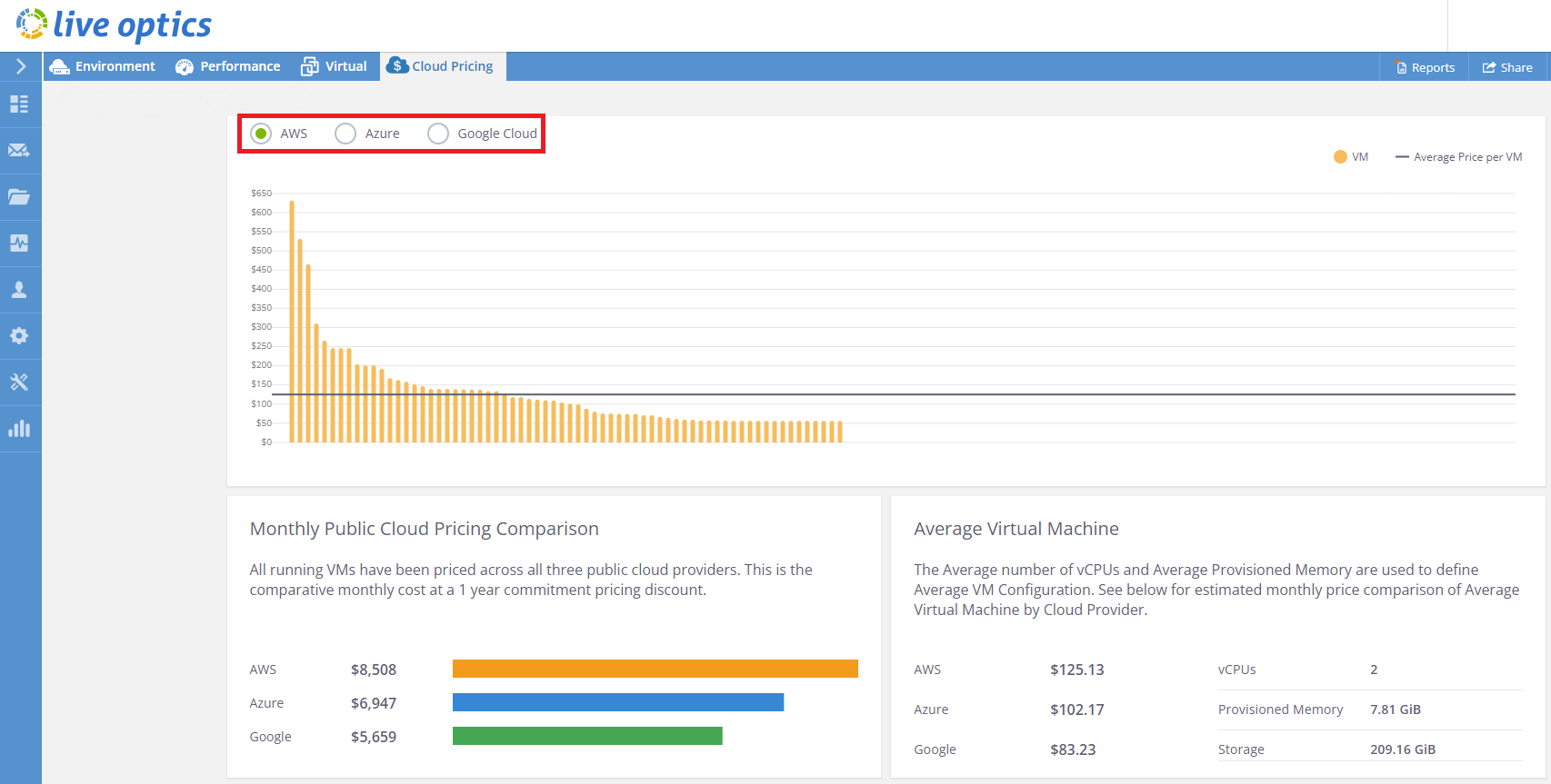 The Cloud Pricing tool uses your on-prem VM configuration assessed by Optical Prime (Guest VMs and Physical Servers with no hypervisors) and queries the price of hosting these VMs on the three main cloud service providers: AWS, Azure, and Google Cloud Platform (GCP). Pricing is displayed on the following ways: