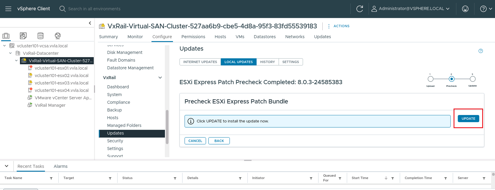 1. Upload the ESXi bundle via VxRail → Updates → LOCAL UPDATES → ESXi Express Patch Updates.