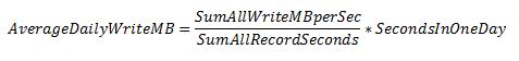 per calcolare le scritture giornaliere medie per una determinata serie di record di I/O, sommare il throughput di scrittura (MB/sec) di tutti i record e la durata di ciascun record. Questa operazione viene eseguita automaticamente in Live Optics e genera un valore di capacità scritto ogni giorno. L'equazione di base per comprendere la scritture giornaliere medie è la seguente: