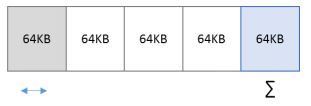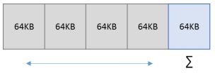 I sistemi potrebbero tentare di eseguire la concatenazione o coalescenza delle scritture per tentare di ottimizzare l'impatto sul disco (in questo caso vengono scritti 256 KB). Ogni disco riceve una pari allocazione di 64 KB. La parità è altrettanto di 64 KB, ma rappresenta solo un overhead del 20% dei 256 KB scritti.