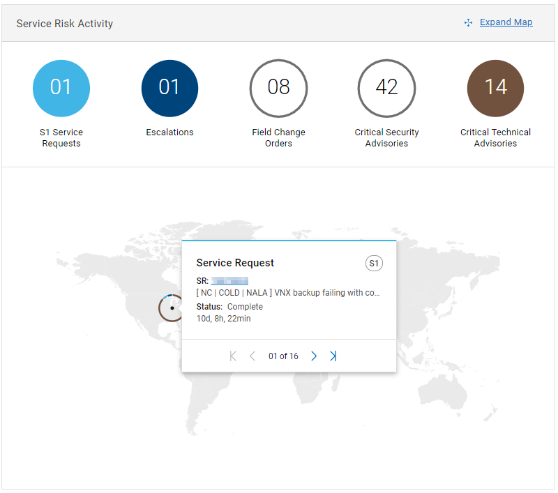 Нажмите Expand map на экране «Service Risk Activity», чтобы открыть полную интерактивную карту и получить доступ к более подробной информации. Содержимое динамически заполняется в соответствии с выбранными действиями по обслуживанию. Карточки с действиями по обслуживанию отображаются в левой части страницы. Выберите площадку на карте, чтобы просмотреть сводную карточку с подробными сведениями о выбранных действиях по обслуживанию в этом местонахождении.
