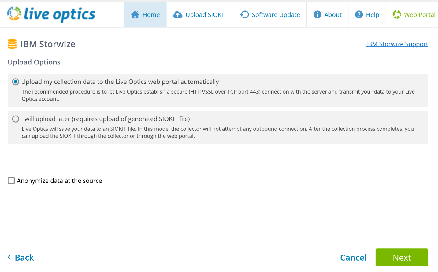 - If the Upload Later option is selected, the SIOKIT must be manually uploaded to the Live Optics portal.