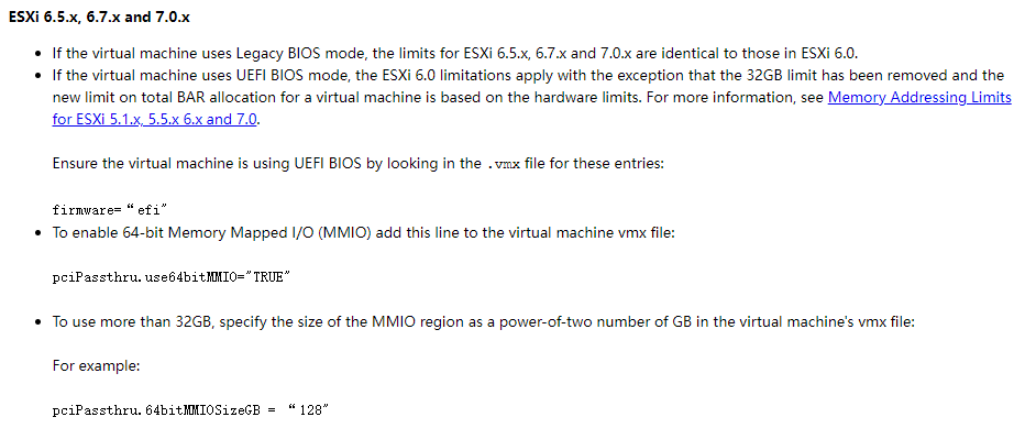 3,一些情况下需要时检查尝试Guest OS模式与MMIO设置,参见Broadcom/vMware LKB 2142307 vSphere VMDirectPath I/O and Dynamic DirectPath I/O: Requirements for Platforms and Devices