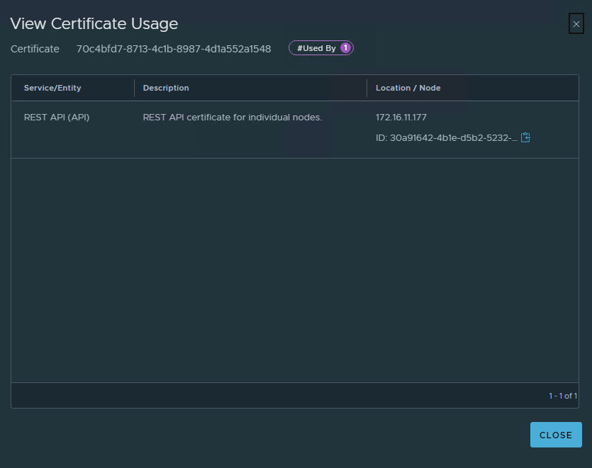 GET https://<nsx-mgr-IP>/api/v1/trust-management/certificates/8cf33cdd-35e4-4ede-89a6-c858c8b6b5c7 "used_by": [ { "node_id": "{name: 'globalmanageridentity',node_id: '405e1100-2997-46df-be45-6ea19dda0bd6',certificate_id: '8cf33cdd-35e4-4ede-89a6-c858c8b6b5c7'}", "service_types": [ "CLIENT_AUTH" ] }