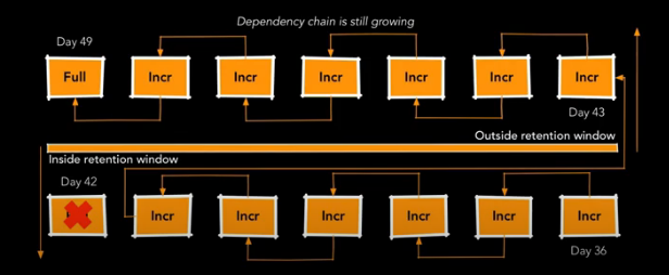 - 下一個排程的增量備份會遵循先前完整備份的鏈結及其後續的增量。這會延伸保留上一個鏈結,直到執行新的完整作業為止。