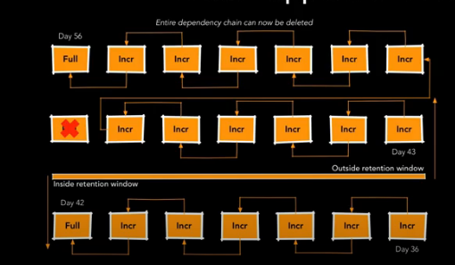 - 在這種情況下,完整備份會超出保留期間;但是,取決於完整備份的增量備份會在保留期間內。